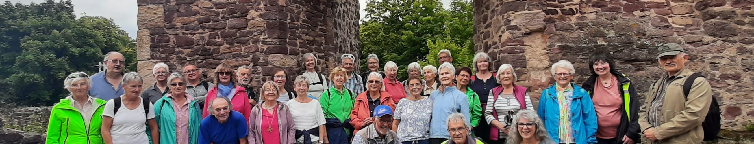 Bei dem Weg durch die Burganlage, gab Walter Gottschall viele interessante Informationen zu den gut erhaltenen und restaurierten Gebäuden wie dm Bergfried und dem anschließenden Palais, die aus den Jahren 1170 -1180 stammen. Beide Gebäude stellten die Macht- und Statussymbole für die Burgherren da. Gleich ein kleines Stück neben der Burg befindet sich die Turmhügelburg, eine einzigartiger Wohn- und Wehrbau aus dem Jahr 1076. Mitten in der Burganlage wurde die evangelische Kirche gebaut, die im Jahre 1669 bei einem Großbrand bis auf die Grundmauern niederbrande. Die Kirche wurde in den Jahren 1710 bis 1718 wieder aufgebaut. Nachdem im Innenraum des Palais ein Gruppenfoto gemacht wurde, ging der Weg weiter, am Burgweiher vorbei, durch das Wohngebiet Alter Berg mit seinen schönen Villen zurück nach Götzenhain.